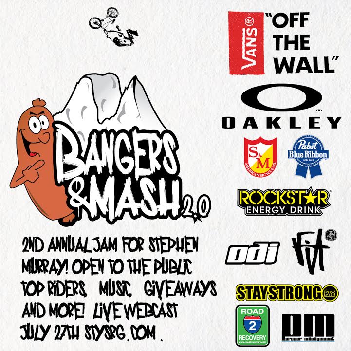 Last year marked the first annual Bangers & Mash BMX Dirt Jumping event at Stephen Murray’s house. Stephen wanted to give back to BMX Dirt and bring back the vibe of the back yard jam. Hundreds of people flocked to his home in Riverside, CA and donations were made at the gate for Stephen. This year’s event is a little later in the schedule because we have expanded to include a live webcast so that everyone can participate and watch the fun. The webcast will be hosted on multiple sites, but you for sure can catch it at www.stysrg.com. All the action will be hosted by BMX Dirt legend, TJ Lavin. Support Stephen Murray with a $5 donation and check out some awesome riding on the backyard, front yard and mini ramp. There will also be live performances from Rick Thorne and Simon Tabron’s bands. Don’t miss a minute of the live webcast July 27th there will be access for the public as well. There will be a free shuttle service from nearby as there is no parking at the house.