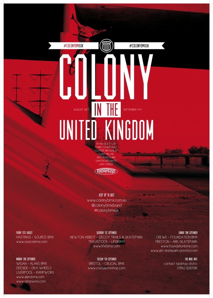The Colony BMX team will be touring the UK at the end of August, travelling to several shops and skateparks around the country. These boys kill it so make sure you don’t miss them! Colony UK riders Anton Mcguirk, Sam Davies-Bate and Liam Vance will also be on the bus.