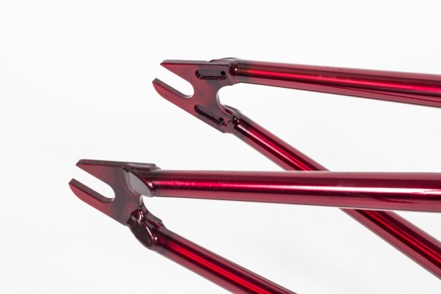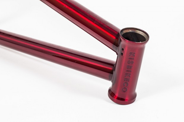 Here’s the newest instalment from the North Yorkshire based Bike Company – Kis Bike Co. The ‘Mirage’ seems to be a great all-rounder, which you can hammer some street on and then take to your local park or trails and it’ll still hold up a treat! The Mirage has Japanese Sanko tubing and this frame is an open dropout setup as opposed to their “Dark” frame, which features closed up dropouts. The geometry of this frame is pretty simple and straightforward, which suits a lot of people. It features an S-bend chain stay, a Spanish BB and an all-new CNC Head tube. In the Translucent Red colour, up close and personal this frame looks a right treat.