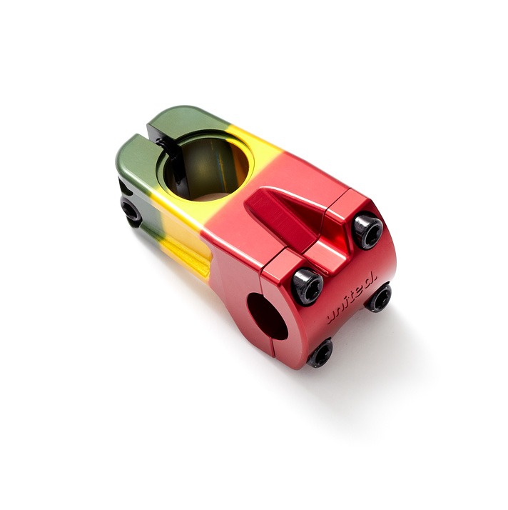 As you’ve probably guessed the “Metro” stem is Ryan Metro’s signature stem from United. It is a front-loader which is precision machined from a single block of 6061 aluminium, has a pretty solid clamping system and a recessed top cap slot that sits flush with a Dinero top cap, and with a washer included so it will look clean with any top cap you choose! There are some carefully placed weight saving cut outs and smooth lines all over. The Rasta design on this one is pretty slick looking’ – Probably one the best Rasta designs we’ve seen so far… Stick this stem on and your bars will thank you for it