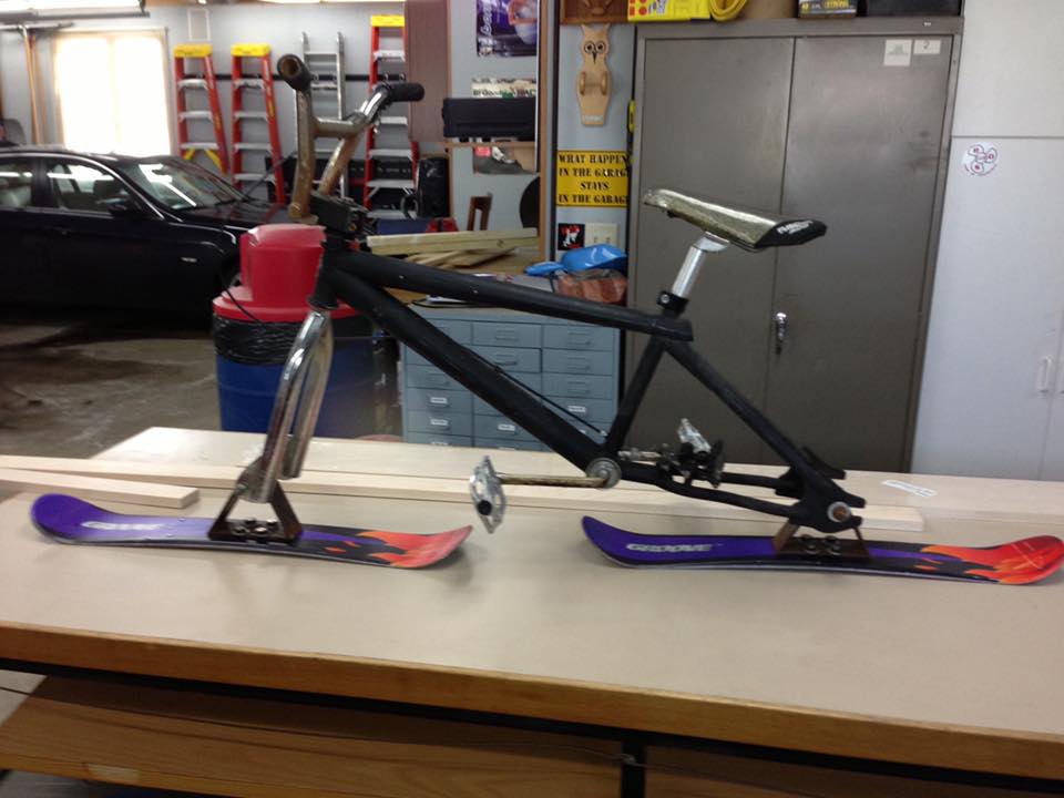 Take a 90’s BMX you’ve had sitting in the garage for a while with some heavy-ass (yet strong and reliable) parts then lace a couple of self-made brackets to some skis and you’ve got a ride that’ll withstand an avalanche!