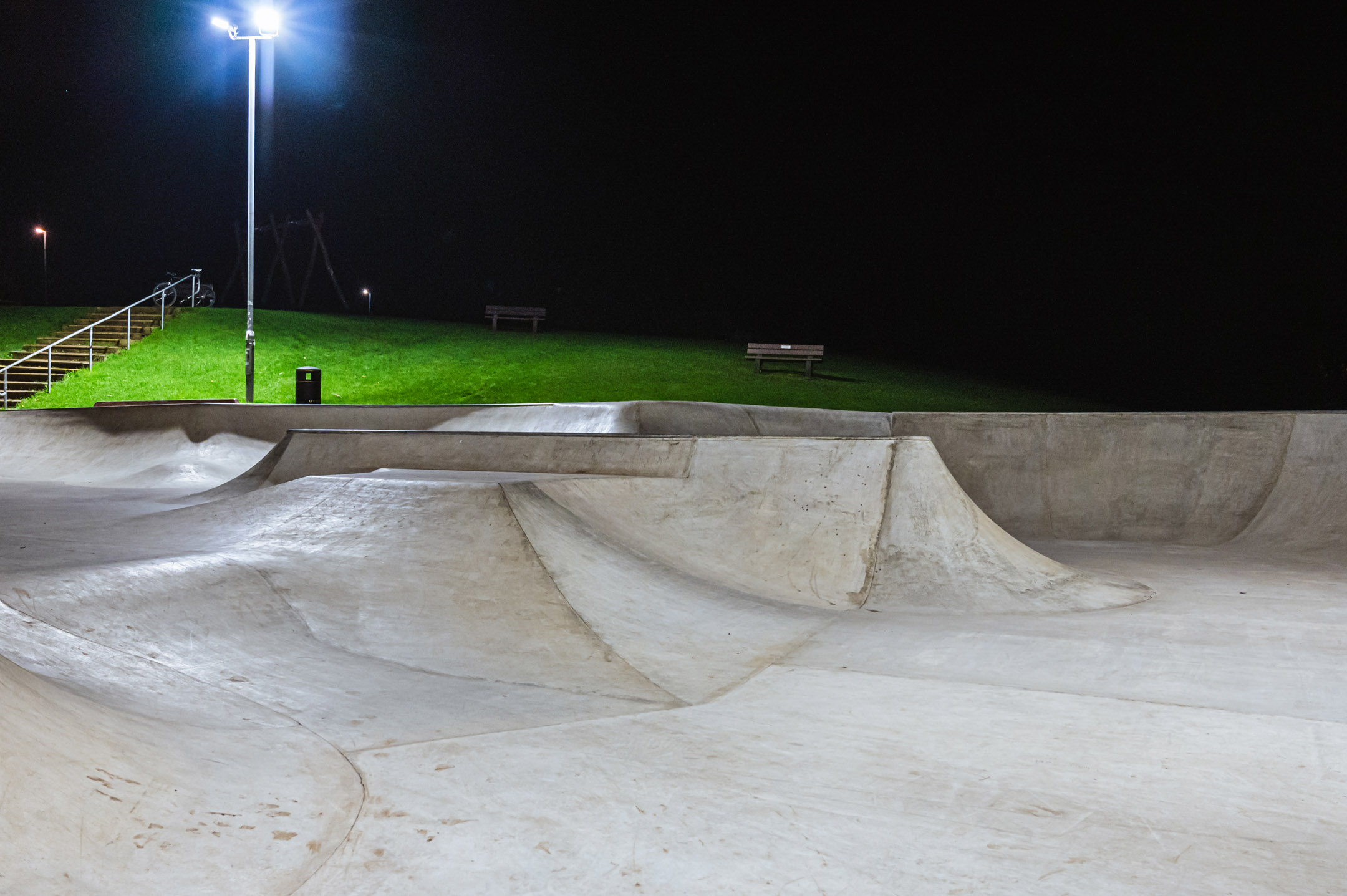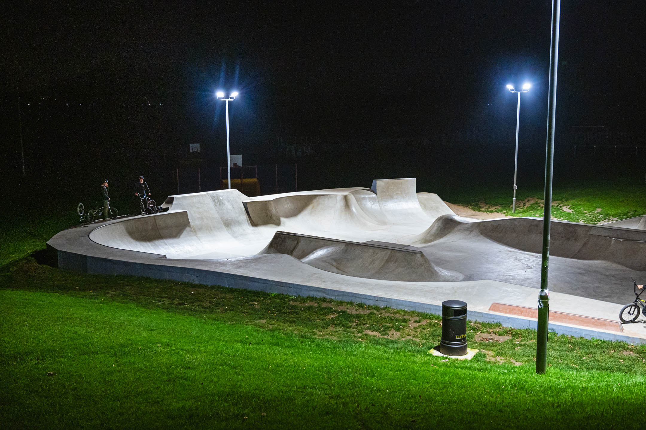 Many will remember the old wooden park on this spot which went through several revisions, with its solid mini ramp and fun curved banked wall. It was a fun set up, but the maintenance of wooden ramps obviously became too much for the local council, so Canvas Spaces were drafted in to create this new concrete park.