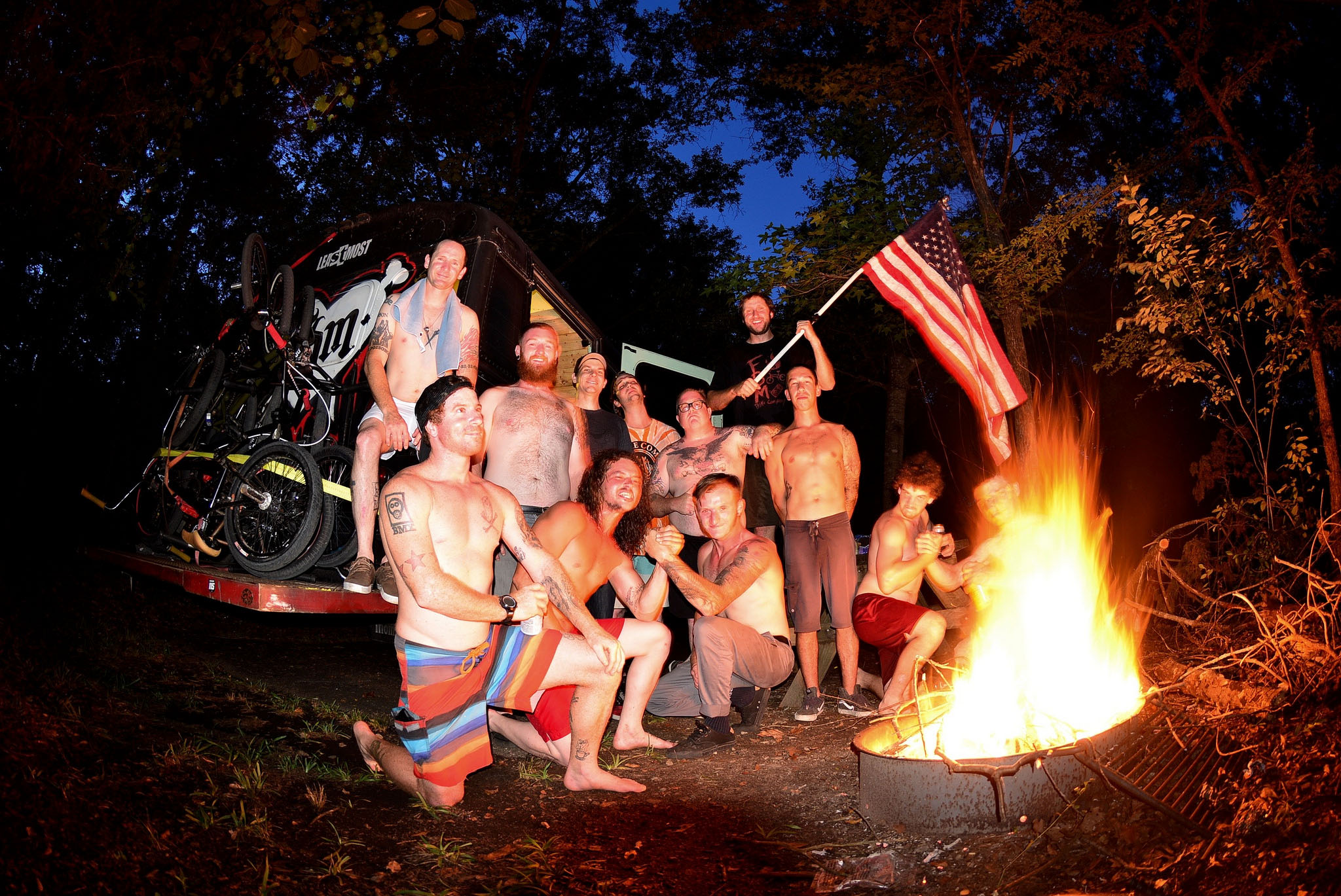 Group Photo from a campsite on one of the Maiden America tours again… We opt to camp on trips when we have the choice, rather than get hotels, partly due to the tight finances we always roll with, but mostly because it’s way more fun to have a fire, cook some food, crack a few cold ones with the crew, than it is to scramble for a wifi password, and a nearby fast food joint for value menu items. The time spent sharing stories around the fire make the time spent making them that much more meaningful!