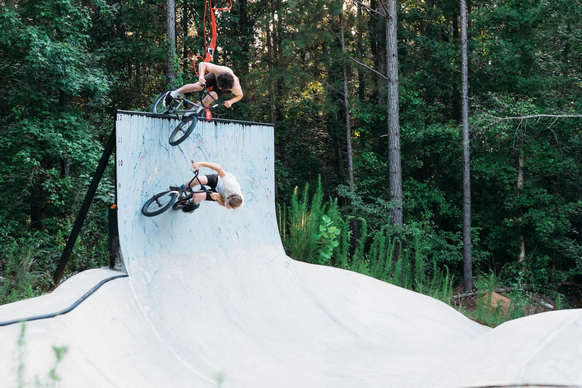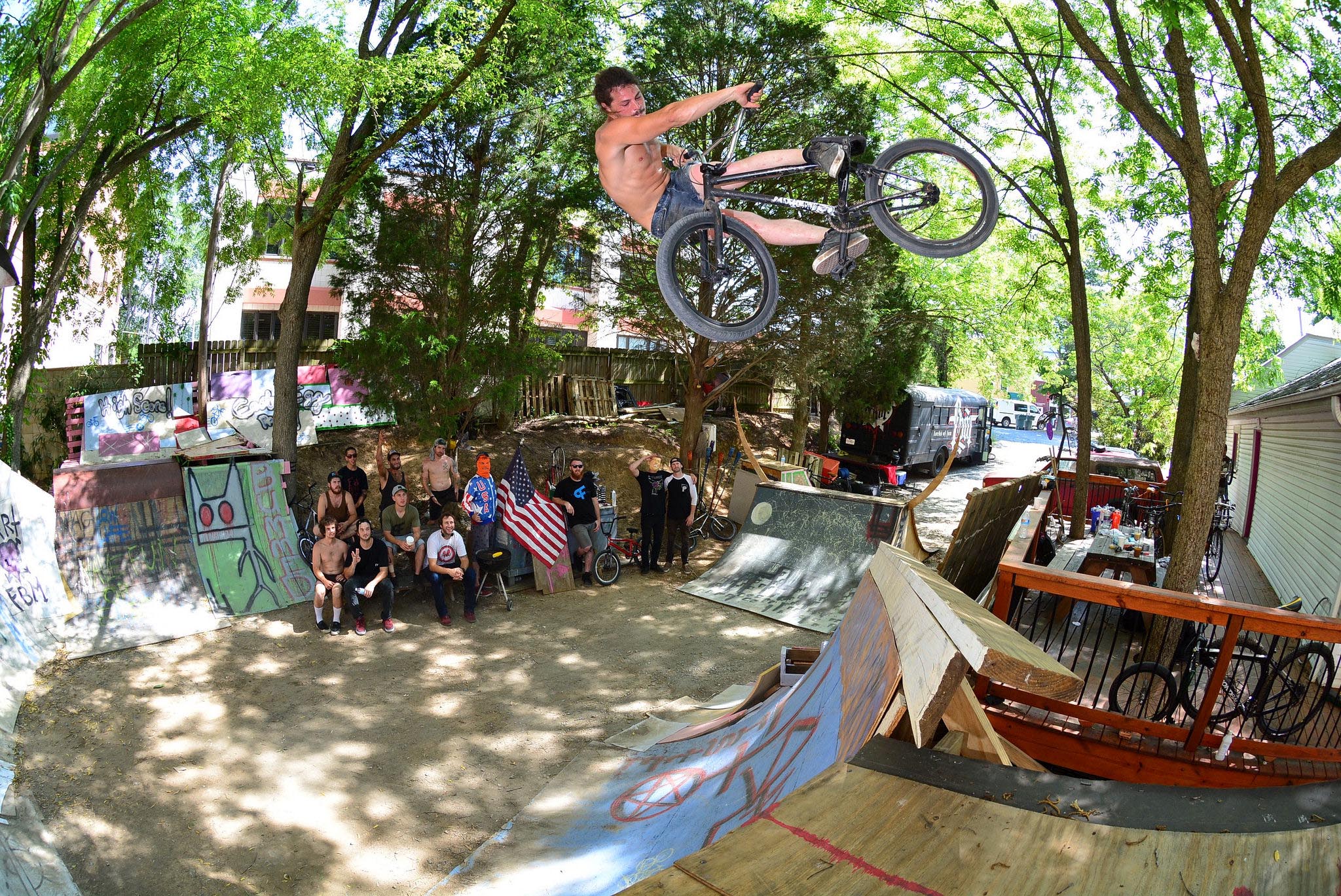 I shot this photo of Garrett Ginch at a spot called Gnarrboro, full crew in the background, maximum stokeage. We camped out on the deck of that ramp, which was behind a shop called Back Alley Bikes, good people doing cool shit. There is a burrito spot across the street, and Hilton Next door. At 5 a.m. garbage trucks came and started emptying their dumpsters like a cruel joke for anyone in vicinity, sleeping outside. More FBM Summer road trip adventures.